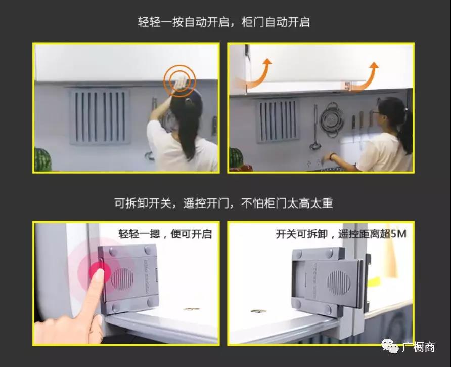 科迪斯智能上翻门系列里面有四种开门方式,分別是上翻折叠门 HF、上翻平移门 HL、上翻平开门HK 和上翻斜移门 HS。只需轻触门板,框门就会自动打开,门边的开关控制器更可以取出来,当作遥控使用。