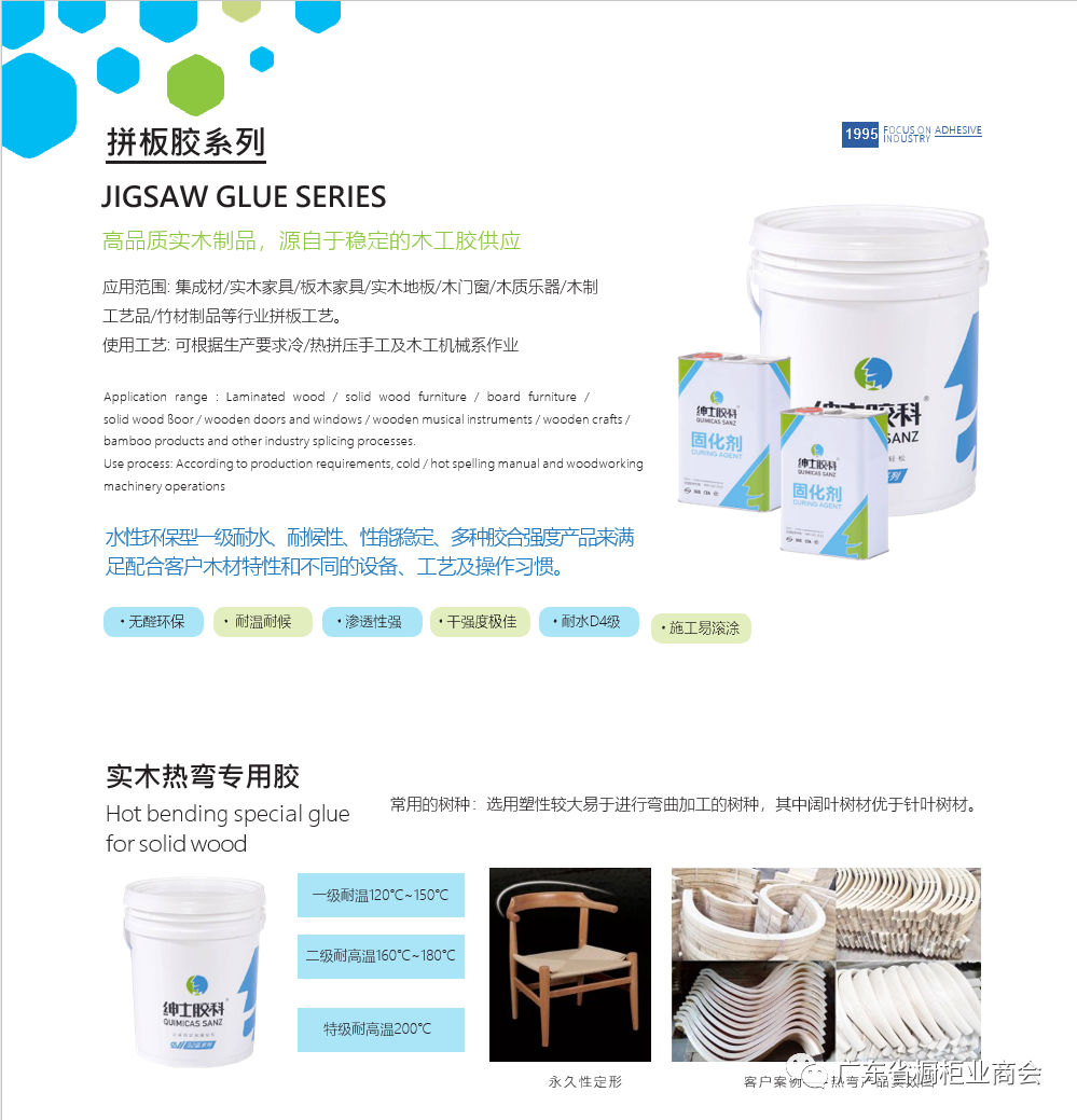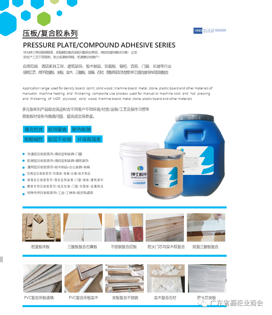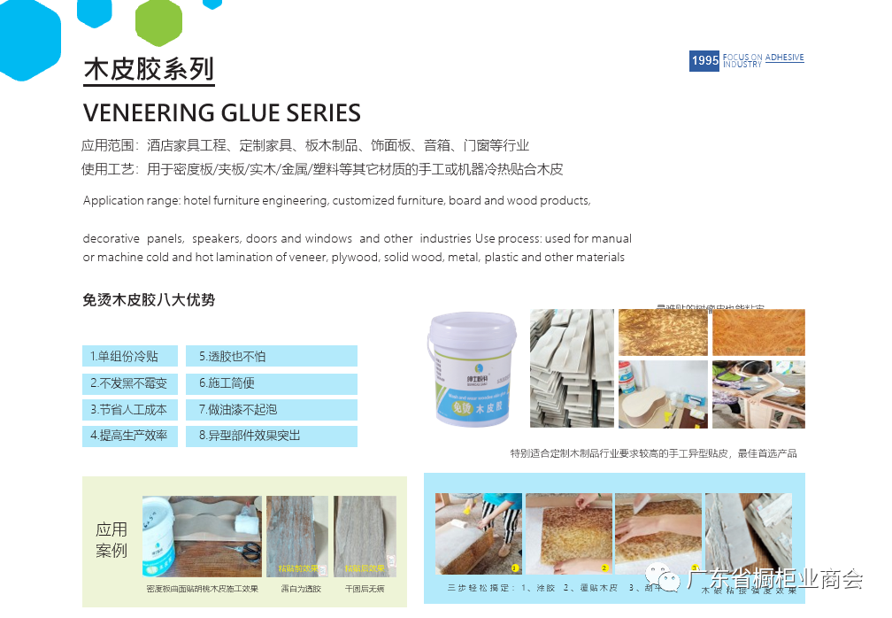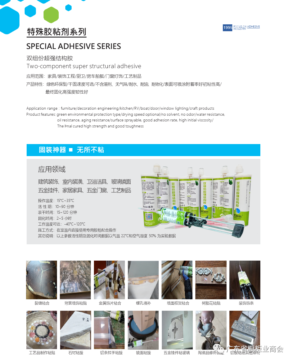 产品涉及服务家居木工、建筑装饰、船艇房车 、电器机械、文具包装、工艺制品、特殊工业胶粘剂等十大行业中。单品应用超过1500多种, 近5年多为客户提供量身定制化产品服务尤为突出,成果案例达50多种,累计超过130多种。