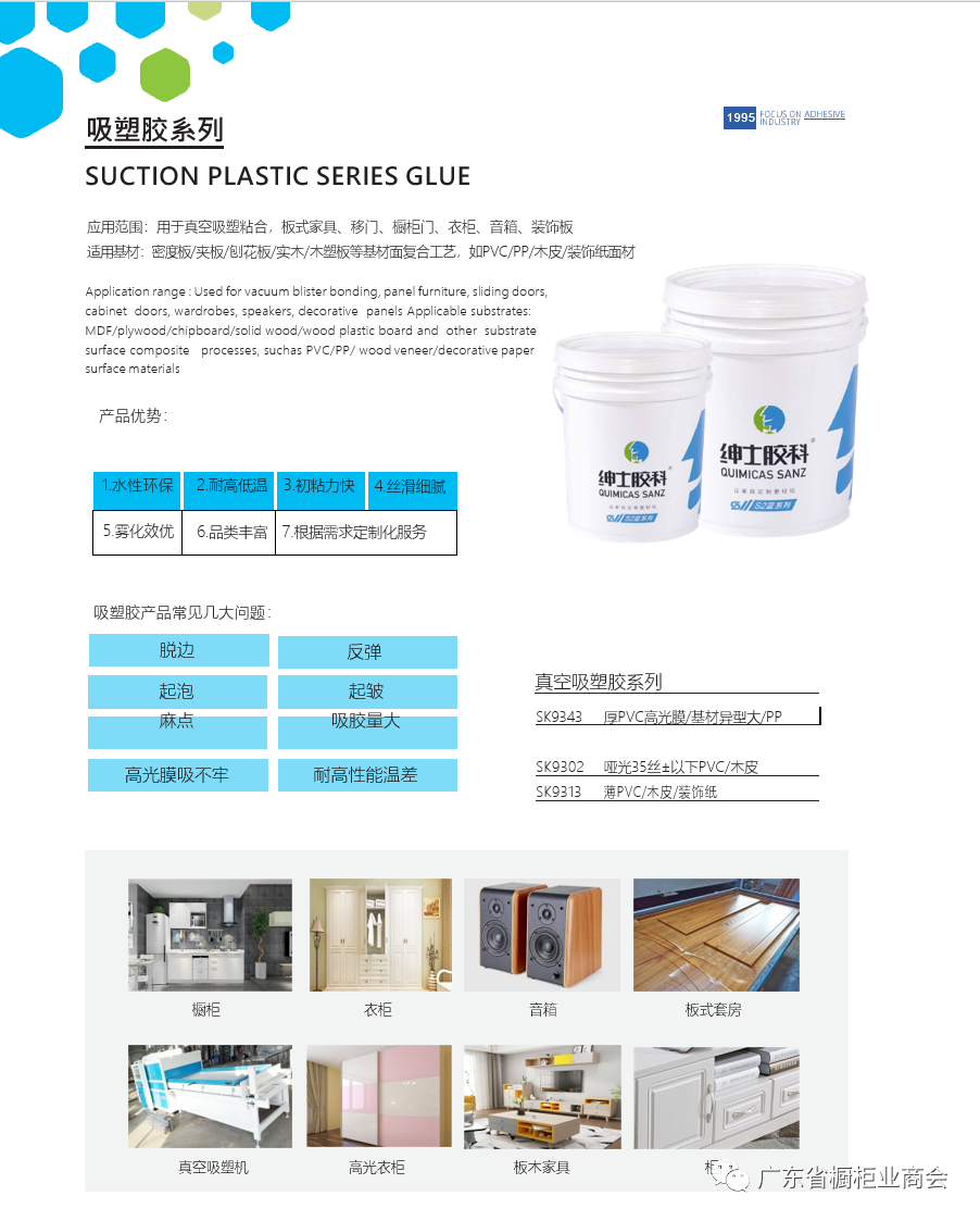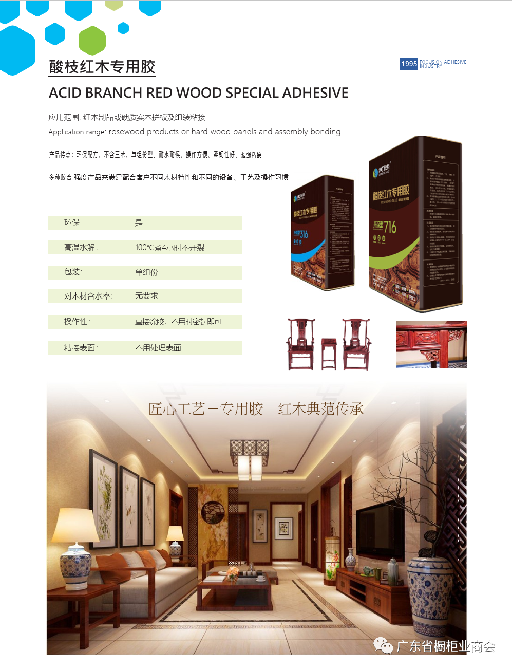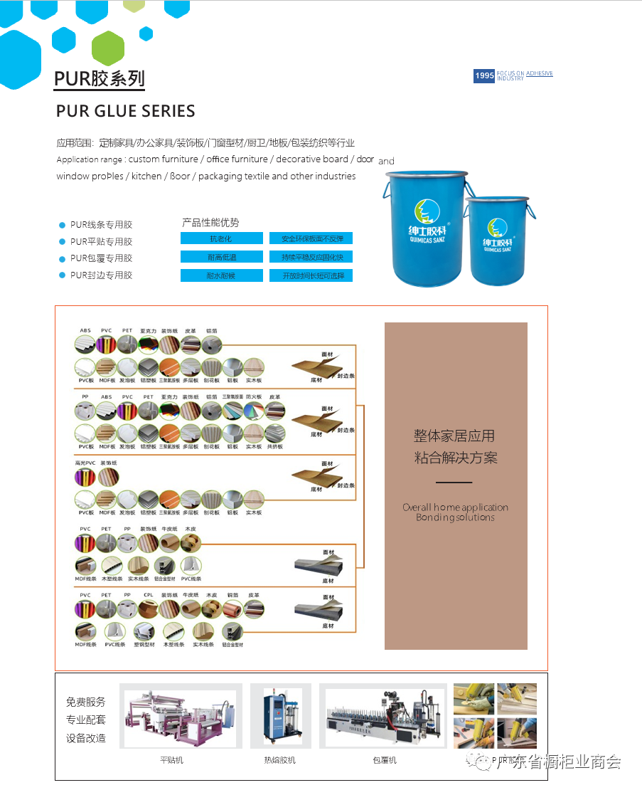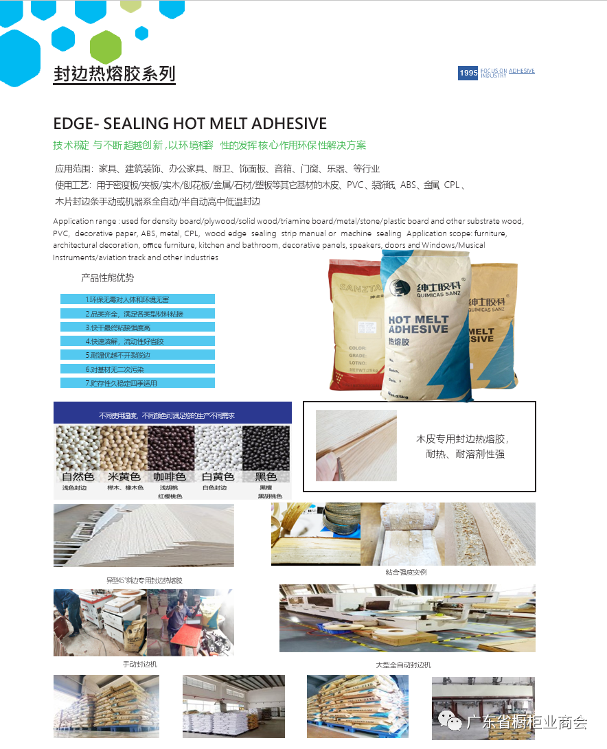 产品涉及服务家居木工、建筑装饰、船艇房车 、电器机械、文具包装、工艺制品、特殊工业胶粘剂等十大行业中。单品应用超过1500多种, 近5年多为客户提供量身定制化产品服务尤为突出,成果案例达50多种,累计超过130多种。