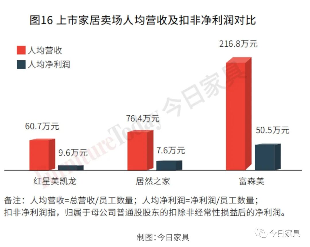 而体现在人均营收和扣非净利润上,这3家的顺序却正好反过来。在人均营收上,富森美达到了超高的216.8亿元,在人均扣非利润上,也远高于红星美凯龙和居然之家。(见图16)