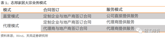 代理模式:代理模式有两种业态,以志邦为例,一种是由定制企业与房地产商签订合同,定制企业供货,由代理商提供相关服务。一种是由定制企业供货,代理商与房地产商签订合同及后续服务。志邦家居大宗业务代理模式占比较高,由代理商签约,代理商履约的业务占比约22%,以公司名义签约销售并委托代理商提供服务的占42%,公司自营占36%。