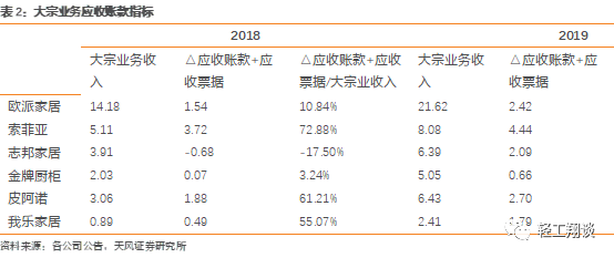 2019年索菲亚、欧派大宗业务分别增长58.1%/52.5%,志邦家居、金牌厨柜、皮阿诺大宗业务分别同比增长64.7%/149.3%/110.0%。