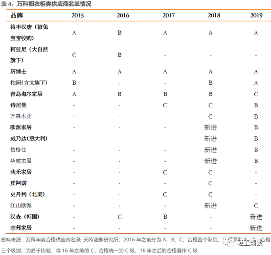 根据万科橱柜类供应商名单的情况来看,精装修工程优秀企业为非上市的定制企业,连续五年上榜的有三家分别是厨博士、裕丰汉唐和海尔家居。通过历年对比,橱衣柜品类竞争显著加强,零售上市公司和海外品牌入围的比例显著增加,19年入围的A股上市公司及其子公司也已经达到了6家,算上之前曾入围过的我乐家居等品牌,一共有9家A股上市公司曾经名列万科合格供应商。