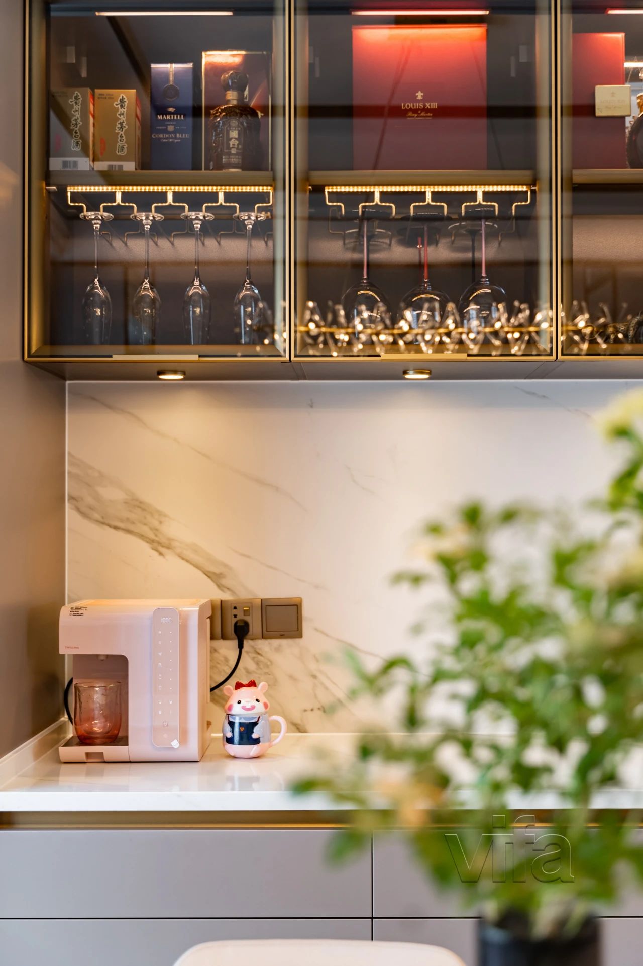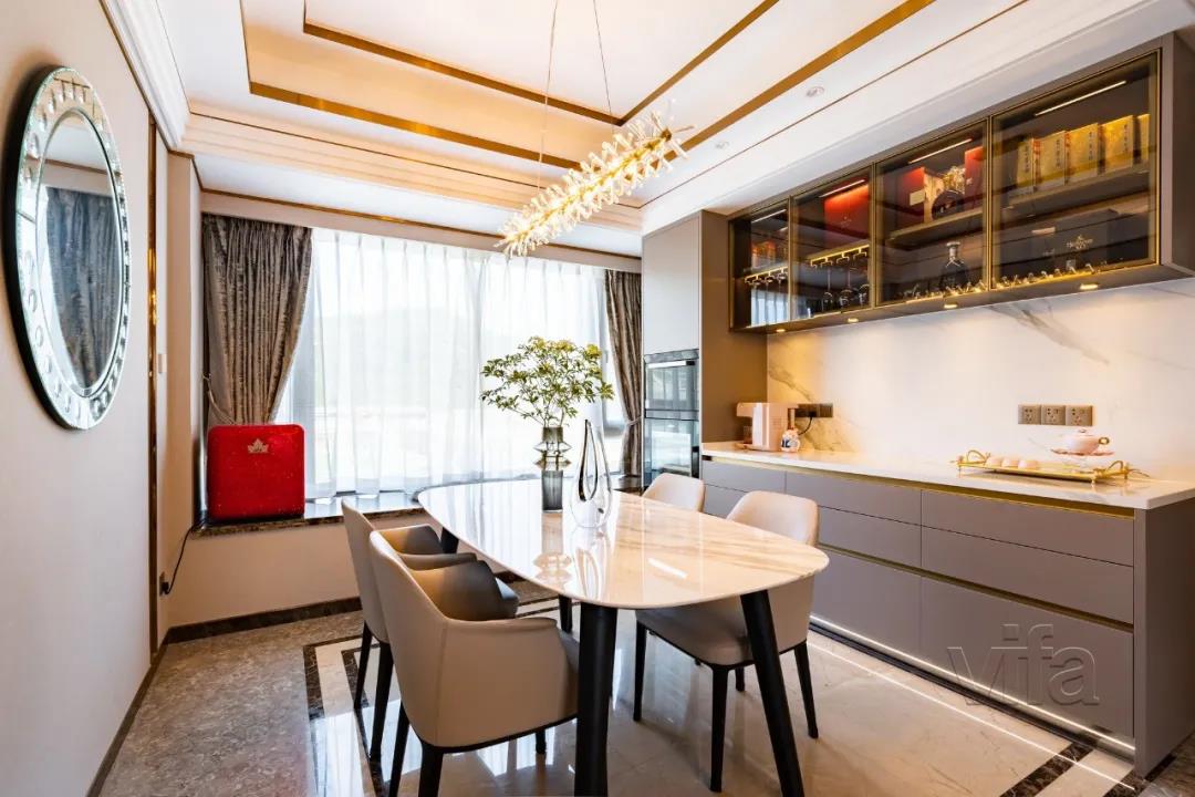 光线透过窗台注入餐厅内,镁铝合金玻璃柜泛起点点星光勾勒出空间的轻奢质感。同时与绒面咖餐边柜形成有趣的呼应,共同组成餐厅区域的背景。