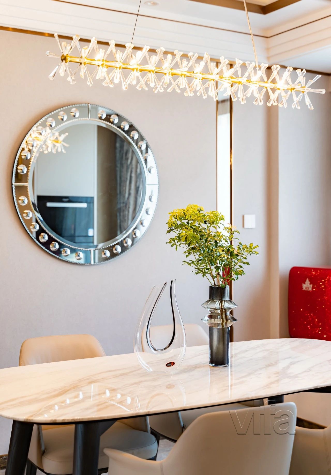 大理石餐桌与皮质餐椅的组合,将家的温馨与精致之感发挥得淋漓尽致。置身其中,真真切切感受到生活的美好。