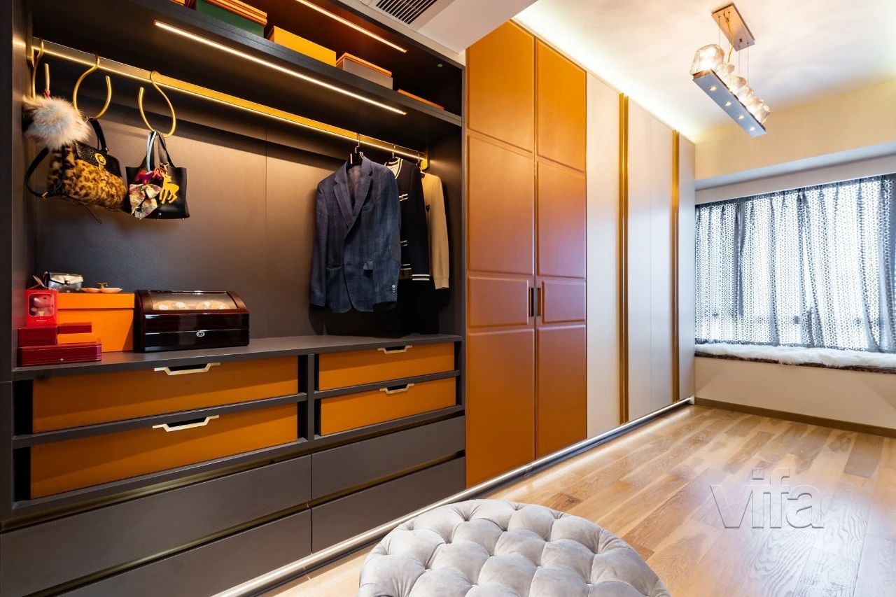 以绒面杏为主色调,线条简洁明了,点睛之笔为爱马仕橙真皮衣柜的嵌入,这一抹亮色将整个画面点亮的同时,让衣帽间变得更加丰富、有趣、个性。