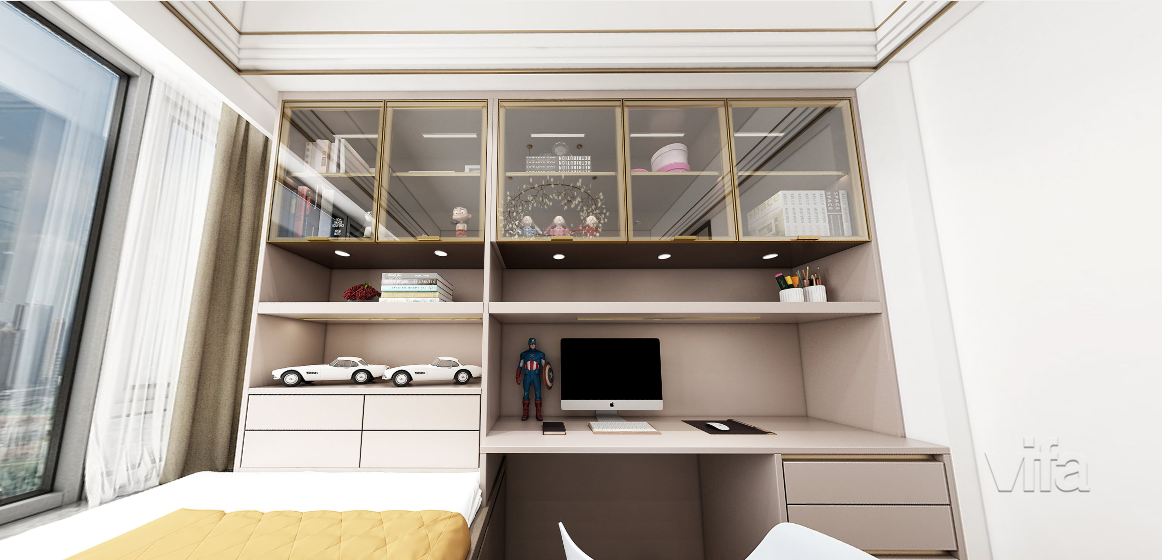 麻雀虽小,五脏俱全。设计师将书柜、书桌以及收纳柜集于一体,可以将书整齐纳入其中,顶上的透明玻璃柜可以摆放男孩的玩具,给孩子学习、玩乐提供了空间。